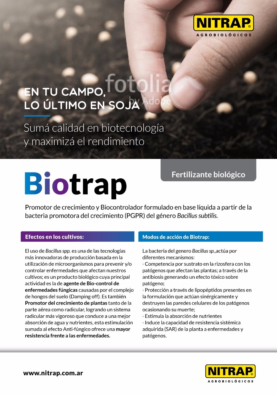 Producto elaborado con bacterias del género Bacillus spp. Promotor del crecimiento de plantas tanto de la parte aérea como radicular. Logra un sistema radicular más vigoroso que conduce a una mejor absorción de agua y nutrientes que sumada al efecto de biocontrolador ofrece una mayor resistencia frente a las enfermedades. Amplio espectro de acción, puede ser utilizado en aplicaciones foliares como radiculares.